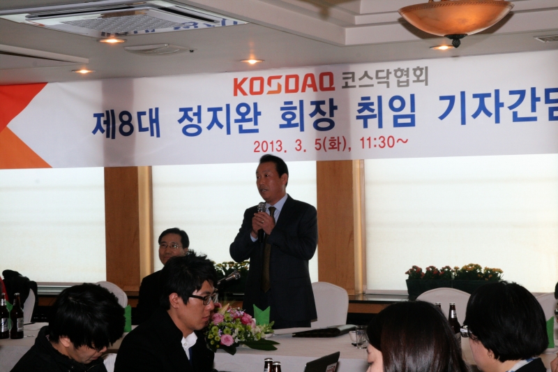 정지완 코스닥협회 신임 회장(솔브레인 대표)은 5일 서울 여의도에서 기자간담회를 갖고 “새 정부의 중소기업정책 힘입어 코스닥 내에 기관·외국인 투자자의 비중이 늘어날 것으로 예상한다”며 “정부정책 및 대기업의 상생경영 방침과 함께 협회 차원에서 신성장동력 찾기, 특허·해외진출 지원 등의 노력을 통해 과거의 영광을 재현할 것”이라고 포부를 밝혔다.